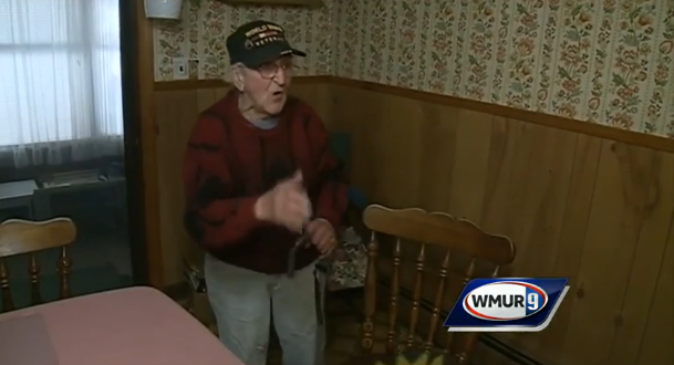 95-årige Arthur Kamberis visade sig nämligen vara en ovanligt handlingskraftig gammal krigsveteran. I stället för att komma undan med bytet så fick rånaren stryk – Kamberis gav honom helt enkelt en omgång med sin käpp.
