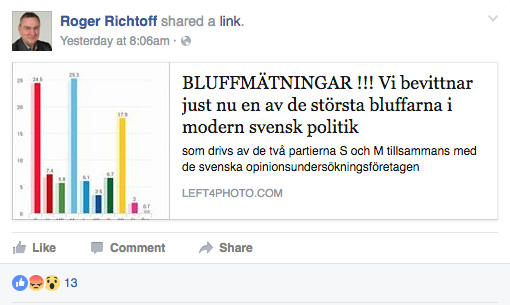 Där hävdar inläggsförfattaren att opinonsmätningarna är riggade i samarbete med Socialdemokraterna och Moderaterna, och att Sverige är inne på en "farlig och destruktiv väg". En som delat det konspiratoriska inlägget är riksdagsledamoten Roger Richtoff.