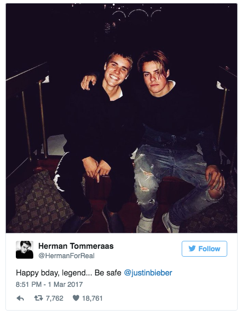 Det visade sig senare att Herman hade använt lite Photoshop för att fixa till bilden. Originalet kommer från nederländska dj:n Martin Garrix som själv skickade en hälsning till Justin på Instagram.