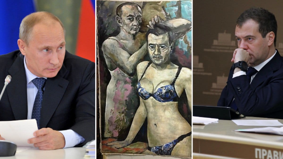 En av tavlorna visade upp landets president Vladimir Putin, klädd i vad som ser ut att vara ett nattlinne, smekandes håret på premiärministern Dmitrij Medvedev. Medvedev är iklädd trosor och behå.