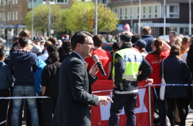 Sverigedemokraternas partiledare Jimmie Åkesson har mötts av högljudda protester och vända ryggar då han har hållit tal i samband med EU-valet.