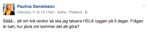 På sin Facebooksida berättar nu Paulina att hon är i full färd med att planera sin nya tatuering. Men det är inte vilken tatuering som helst. Paulina planerar nämligen att tatuera hela ryggtavlan – under loppet av fem dagar.