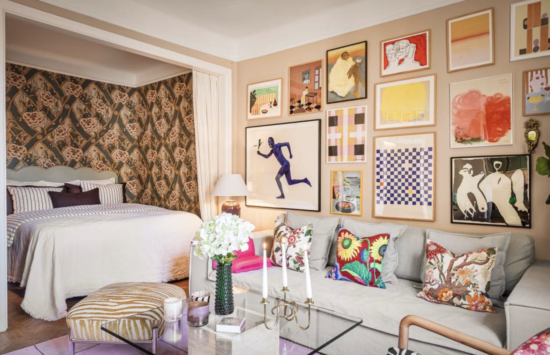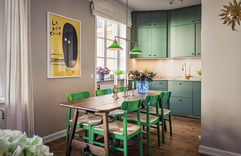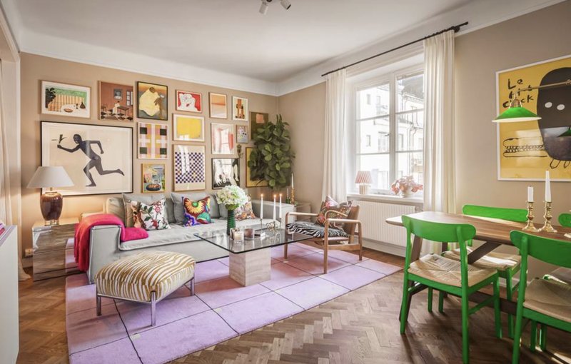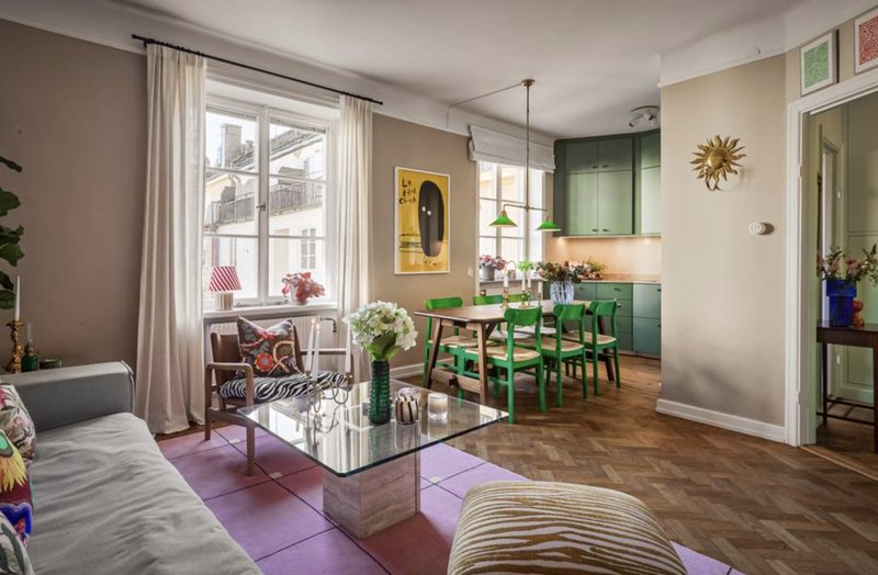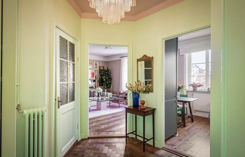Lägenheten är en 1,5-rummare på 42 kvadratmeter med sovalkov och fiskbensparkett. Lägenheten har färgstarka detaljer med rosa tak, väggar i grönt och en Gucci-tapet i sovalkoven. Den är belägen i ett hus från 1930-talet.