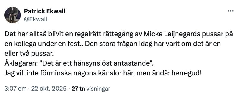 "Det har alltså blivit en regelrätt rättegång av Micke Leijnegards pussar på en kollega under en fest.. Den stora frågan idag har varit om det är en eller två pussar. Åklagaren: "Det är ett hänsynslöst antastande". Jag vill inte förminska någons känslor här, men ändå: herregud!"