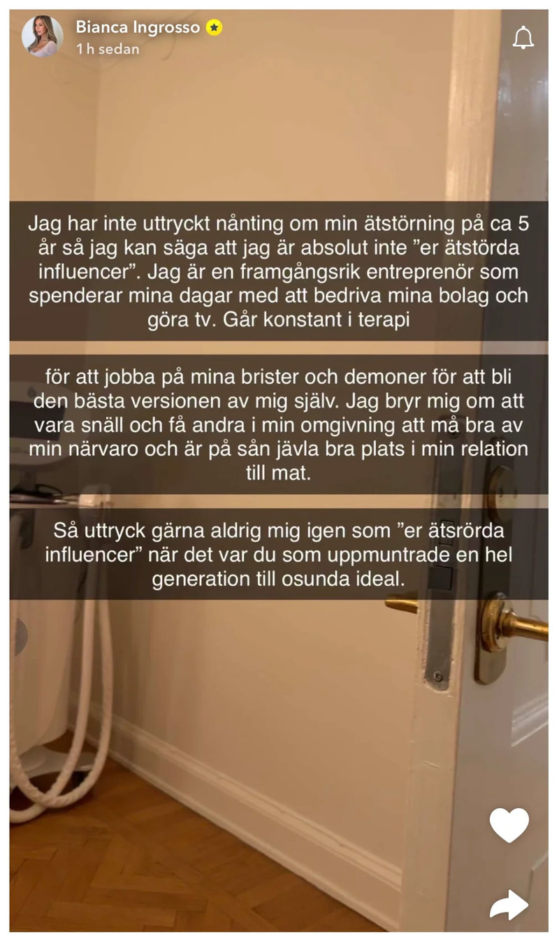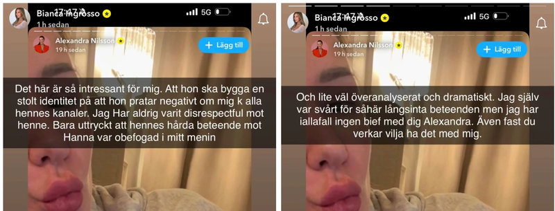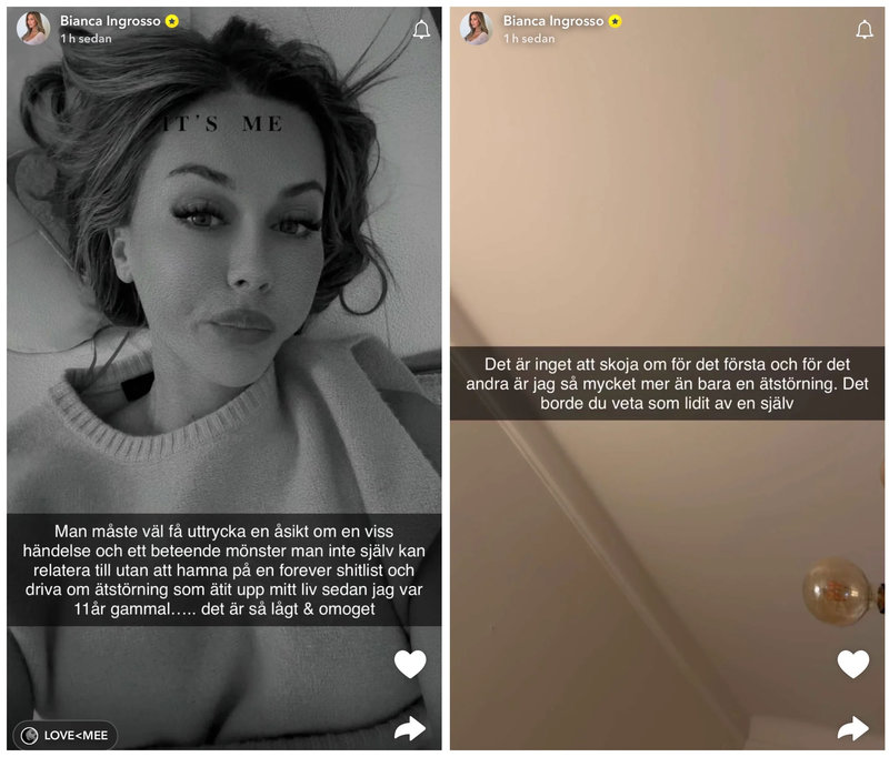 I en serie storys på Snapchat så skrev Bianca och ifrågasatte varför Alexandra "drev om hennes ätstörning".