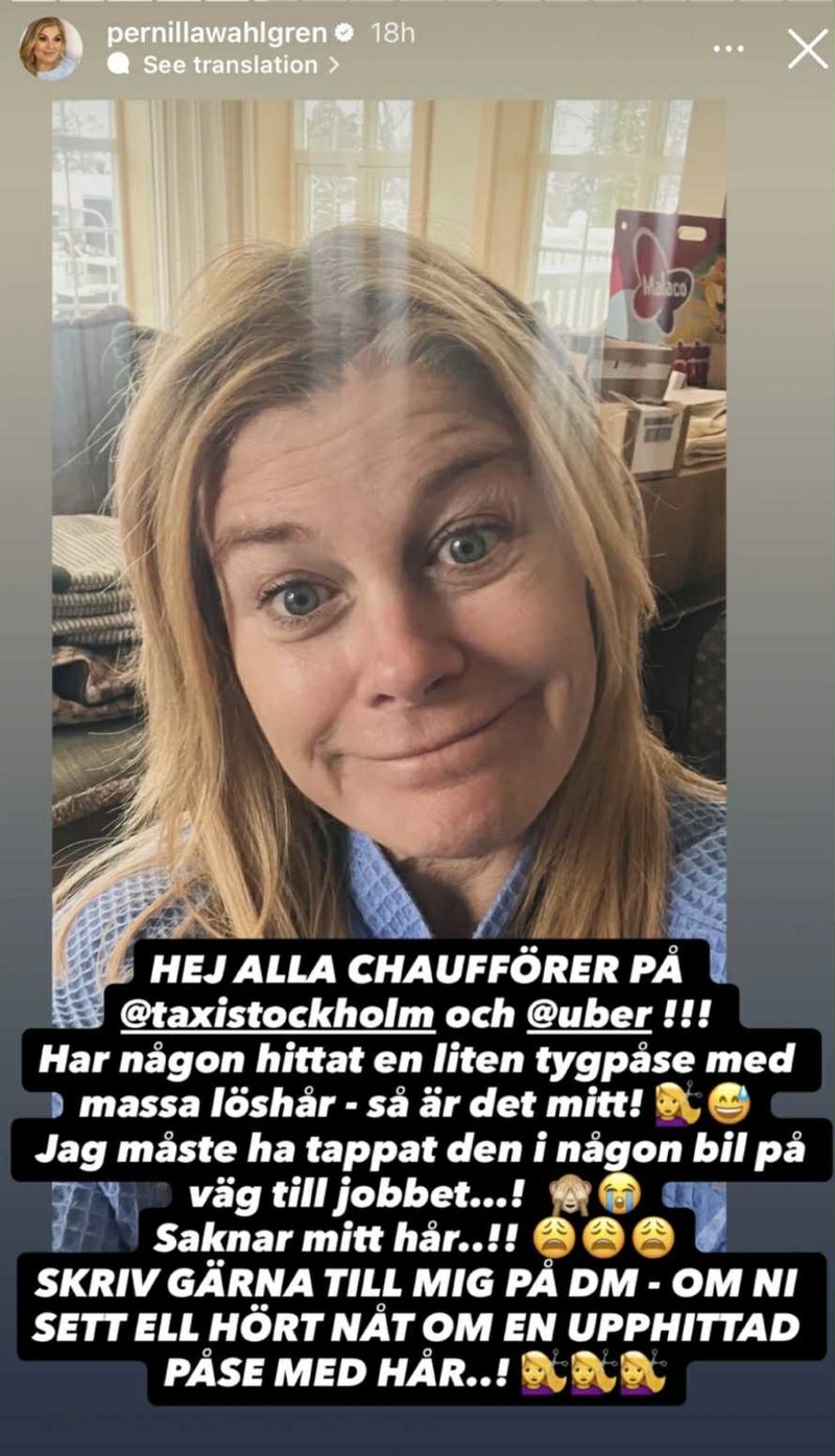 I sin story skrev Wahlgren med stora bokstäver: “Saknar mitt hår”.