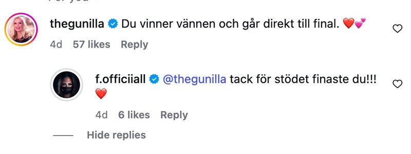 Och ja, är det någon som unnar Felicia en succé i Melodifestivalen 2026 så är det Gunilla, som redan innan deltävlingen skrev att Felicia skulle gå vidare.
