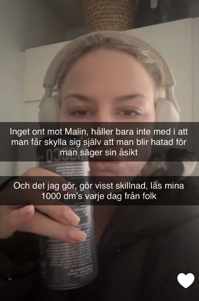 "Inget ont mot Malin, håller bara inte med i att man får skylla sig själv att man blir hatad för man säger sin åsikt"