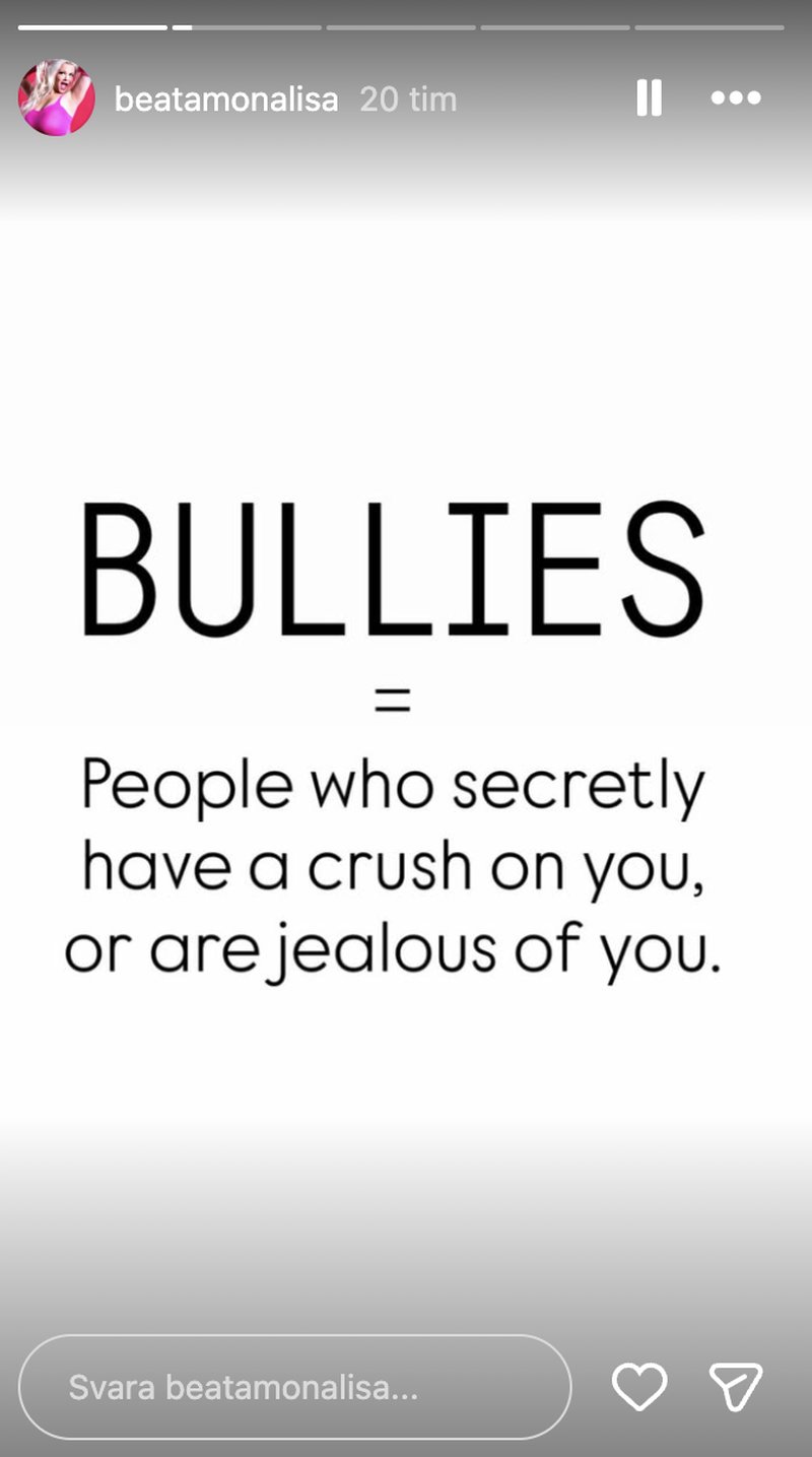 I en senare story skriver hon: "MOBBARE = Människor som i hemlighet har en crush på dig, eller är avundsjuka på dig", står det att läsa på bilden.