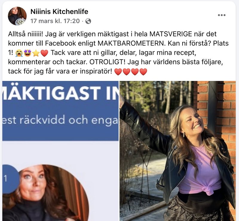 "Alltså niiiiii! Jag är verkligen mäktigast i hela MATSVERIGE när det kommer till Facebook enligt MAKTBAROMETERN. Kan ni förstå? Plats 1! Tack vare att ni gillar, delar, lagar mina recept, kommenterar och tackar. OTROLIGT! Jag har världens bästa följare, tack för jag får vara er inspiratör!", skrev hon på Facebook.