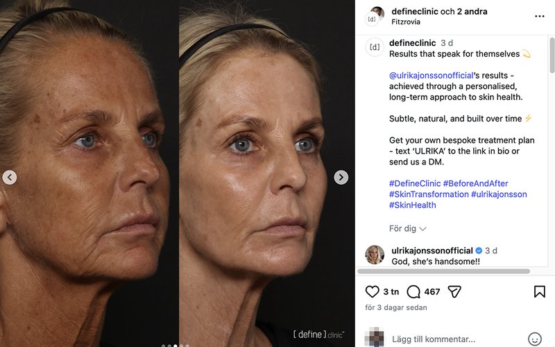 "Hon ville inte se 20 år yngre ut, det handlade om att se så bra ut som möjligt för sin ålder – och ännu viktigare, att fortfarande se ut som sig själv", säger han och tillägger: "Vi är jätteglada över Ulrikas resultat som känns äkta och naturliga. Mest av allt känner sig Ulrika fortfarande som sig själv, bara mer utvilad och med ännu mer självförtroende."