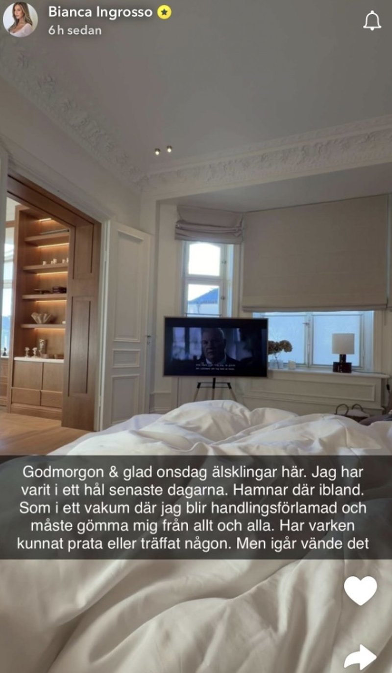 Bianca Ingrosso är en riktig Snapchat–veteran och delar titt som tätt med sig av uppdateringar från livet. Därför märker Snapchat-följarna direkt när någonting inte står helt rätt till. Nu öppnar Bianca upp sig om måendet. I ett inlägg på Snapchat skriver hon: