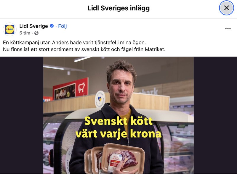 "En köttkampanj utan Anders hade varit tjänstefel i mina ögon. Nu finns iaf ett stort sortiment av svenskt kött och fågel från Matriket", skriver Lidl i sin skämtannons.