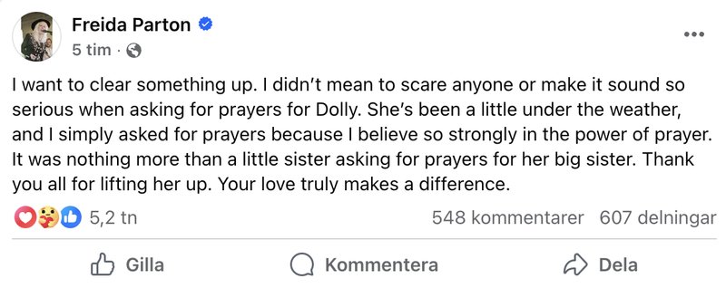 "Jag vill förtydliga något. Jag ville inte skrämma upp någon eller få det att låta så allvarligt när jag bad om böner för Dolly. Hon har mått lite dåligt, och jag bad helt enkelt om böner för jag tror så starkt på bönernas makt. Det var inget mer än en lillasyster som bad om böner för sin storasyster. Tack alla för att ni lyfter henne. Er kärlek gör verkligen skillnad".