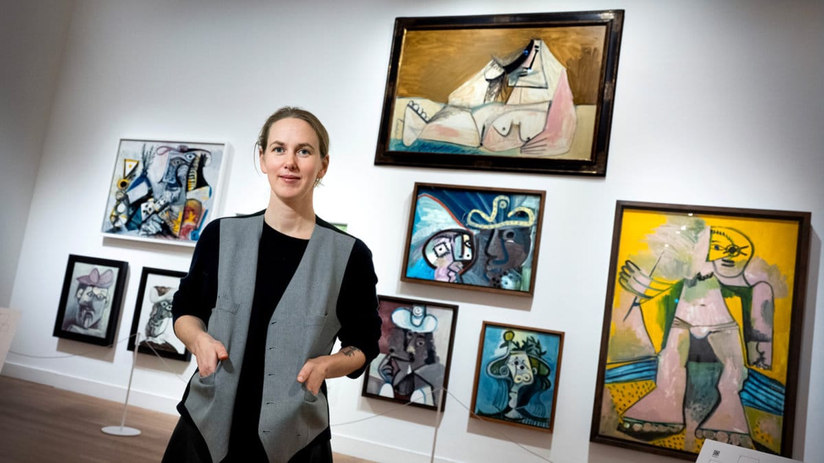 — Intressant i den här sena perioden är att kvinnorna ändå har ett slags pondus, även om de är nakna och fragmentiserade, medan männen och bilder av Picasso själv får rollen av att vara lite underliga. Jag hittar inget bättre ord än impotenta, säger Jo Widoff och visar några musketörliknande män på väggen mitt emot.