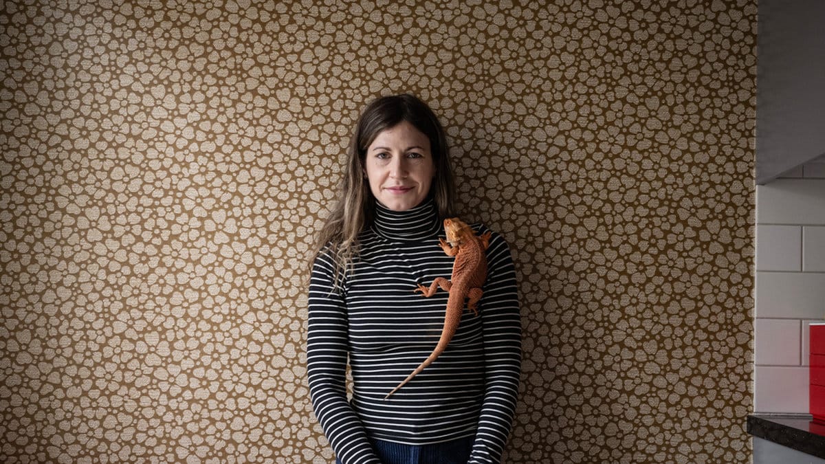 Nour El Refai tillsammans med ödlan X som införskaffades till sonen i samband med separationen från Henrik Schyffert. "Det är en rolig bild av var man plötsligt befinner sig i livet, att så hoppsan, skild med skäggagam. Att vara en sådan som plötsligt plockar kackerlackor med pincett." Foto: Fredrik Sandberg/TT