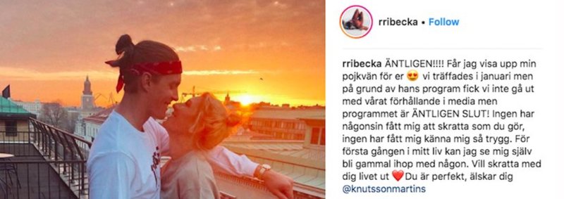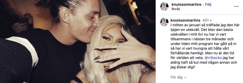 Profilerna tvingades dock att första tiden hålla sin kärlek hemlig. Detta var på grund av att Martin precis som Ribecka, varit med som deltagare i ett dejtingprogram. Programmet han var med hette "Are you the one". Men kärleken – den hittade han efteråt.