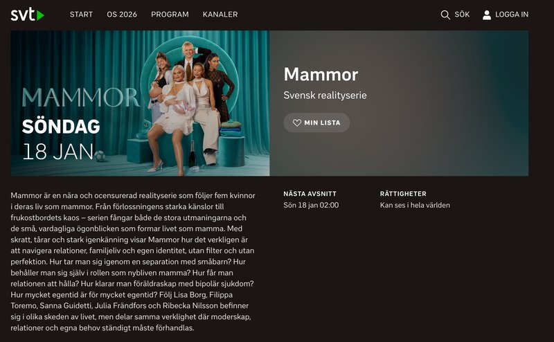 Ja. Söndag 18 januari har programserien "Mammor" premiär på SVT Play. I den kommer tittarna att få följa Lisa Borg, Filippa Toremo, Sanna Guidetti, Julia Frändfors och Ribecka Nilsson som alla befinner sig i olika skeden av livet. Den gemensamma nämnaren – det är att de alla är mammor.