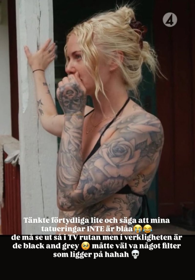 "Tänkte förtydliga lite och säga att mina tatueringar INTE är blåa. De må se ut så i tv-rutan men i verkligheten är de black and grey. Måtte väl vara något filter som ligger på", skrev hon.