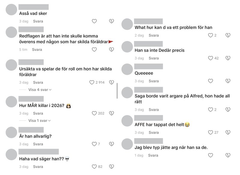 I Love Island Sverige och TV4:s ociala medier är det flera som uttrycker sitt missnöje gentemot det Alfred säger angående Sagas föräldrar och deras skilsmässa. Användarna skriver bland annat: “What hur kan det vara ett problem för han” , “Ursäkta vad spelar det för roll att hon har skilda föräldrar” och “Är han allvarlig”.