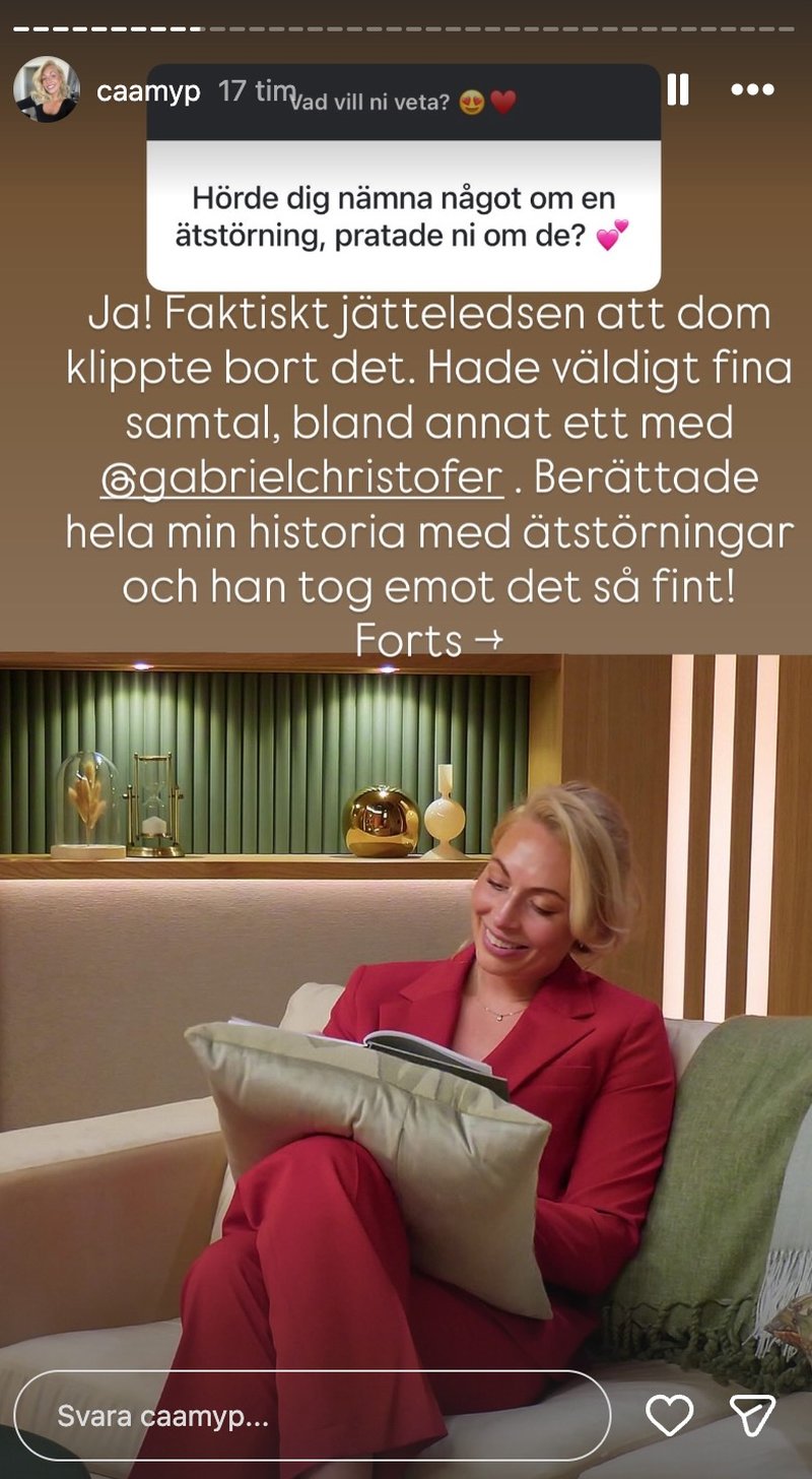 "Jag blev faktiskt jätteledsen över att se klippte bort det. Hade väldigt fina samtal med bland annat Gabriel. Berättade hela min historia med ätstörningar och han tog emot det så fint", skriver Camilla.