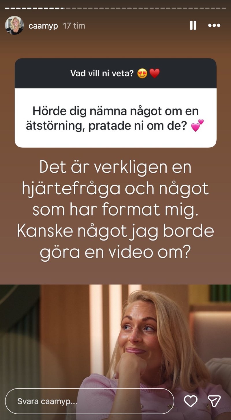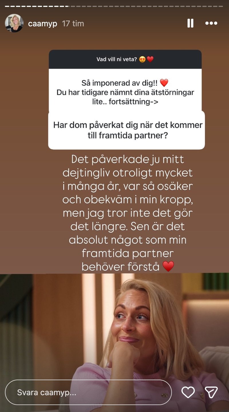 När Camilla var yngre så levde hon under många år med en ätstörning, någonting hon valde att öppna upp om med vissa i programmet.