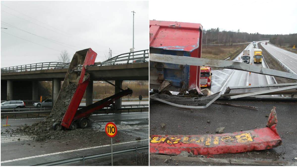 Lastbil med släp krockade på bro – här är bilderna från den sjuka kraschen