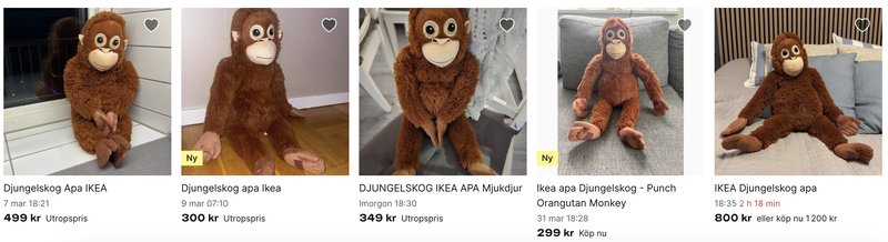 Den stora efterfrågan har därför gjort att apan säljs dyrt second hand. I butiken kostar gosedjuret 149 kronor, men på Tradera ligger flera ut till ett betydligt högre pris. En av gosedjursaporna ligger ute för 800 kronor och en annan för 1 000 kronor.