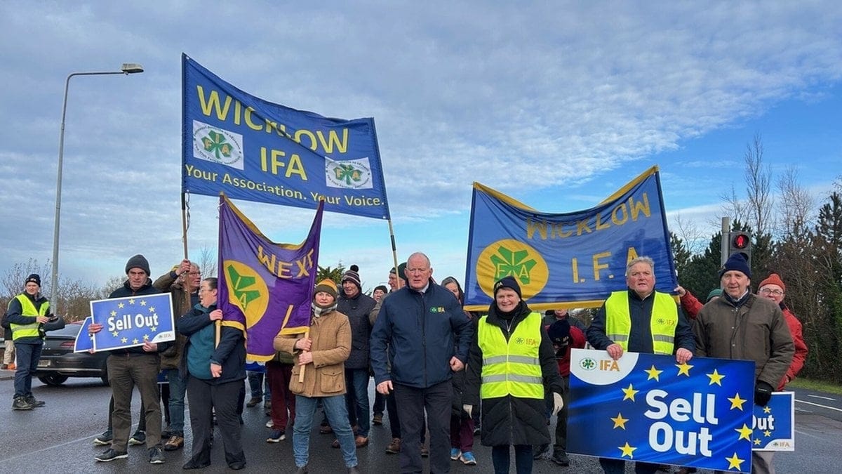 Bland demonstranterna som marscherar på en väg tillhörande Athlone i mellersta Irland på lördagen syns traktorer och plakat med texten ”Stoppa EU-Mercosur”.