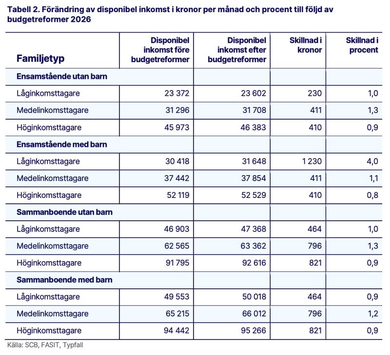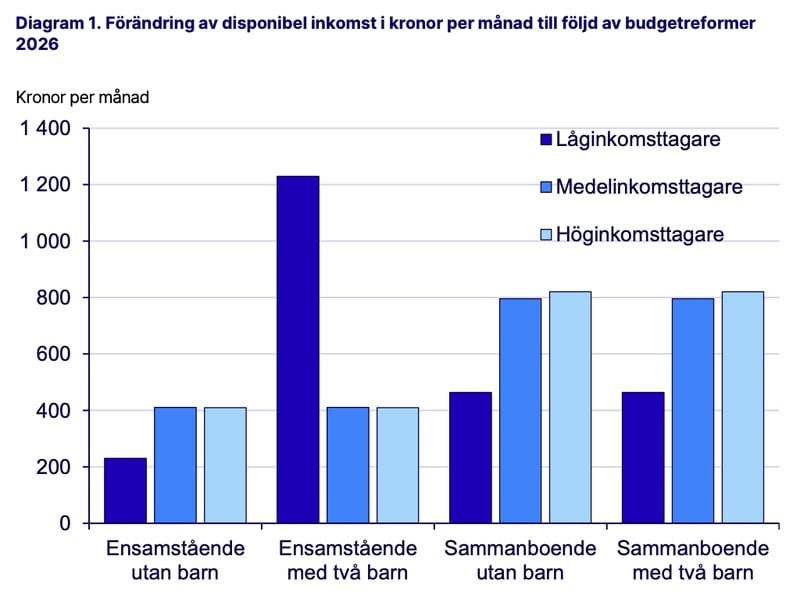 "Alla familjer får en högre disponibel inkomst. Störst ökning får ensamstående låginkomsttagare med barn, vilket beror på det höjda bostadsbidraget. I övriga familjetyper får låginkomsttagare en mindre ökning än medel- och höginkomsttagarna, eftersom förstärkningen av jobbskatteavdraget gynnar dessa grupper i större utsträckning än låginkomsttagarna", skriver man i rapporten "Effekter för hushållens ekonomi i statens budget 2026".