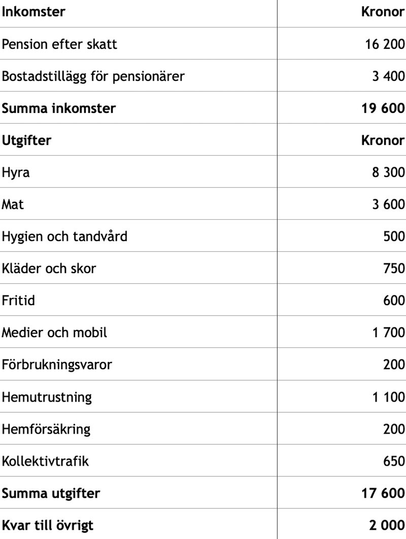 Budget för baspensionären – 19 500 kronor i pension före skatt