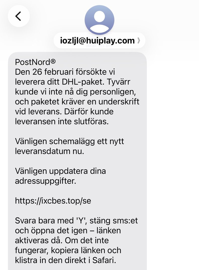 Nu har det hänt ytterligare en gång. Den här gången är det Postnord vars företagsnamn utnyttjas i bedrägliga syften. I ett sms, som Nyheter24 tagit del av, skriver en avsändare bestående av bokstäver som utgör en mejladress att en misslyckad leverans genomförts. Därför behövs uppdaterade adressuppgifter för att kunna slutföra leveransen. Avsändaren i ett av sms:en heter "iozljl2@huiplay.com".