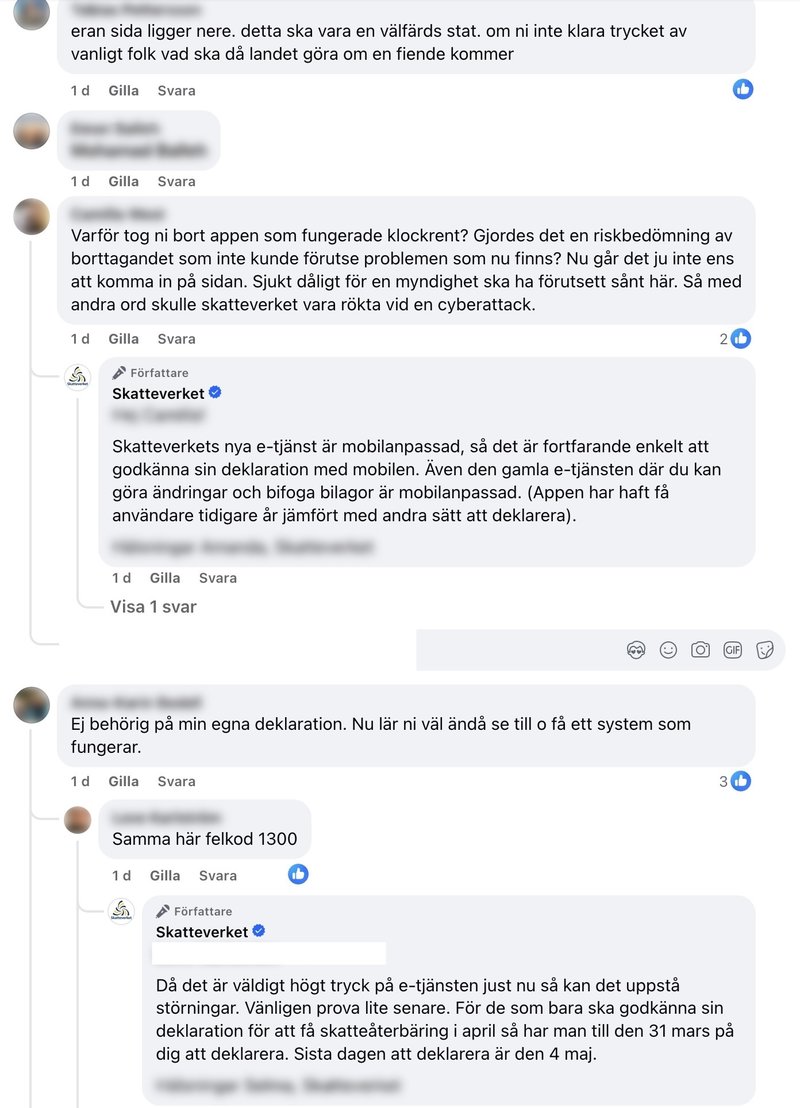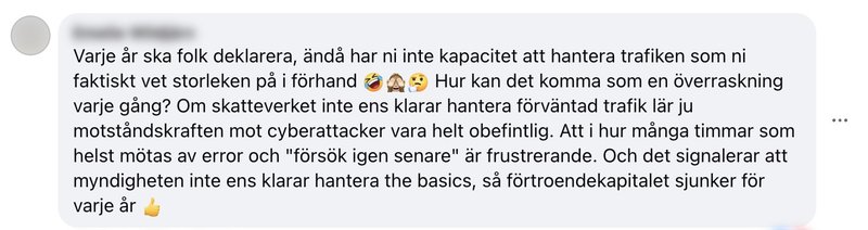 "Varje år ska folk deklarera, ändå har ni inte kapacitet att hantera trafiken som ni faktiskt vet storleken på i förhand. Hur kan det komma som en överraskning varje gång? Om Skatteverket inte ens klarar hantera förväntad trafik lär ju motståndskraften mot cyberattacker vara helt obefintlig. Att i hur många timmar som helst mötas av error och 'försök igen senare' är frustrerande. Och det signalerar att myndigheten inte ens klarar hantera the basics, så förtroendekapitalet sjunker för varje år", dundrar en upprörd person ut i kommentarsfältet.
