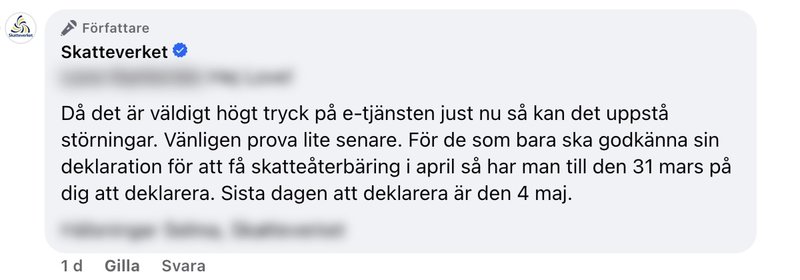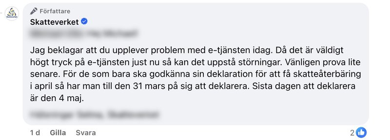 "Jag beklagar att du upplever problem med e-tjänsten i dag. Då det är väldigt högt tryck på e-tjänsten just nu så kan det uppstå störningar. Vänligen prova lite senare. För de som bara ska godkänna sin deklaration för att få skatteåterbäring i april så har man till den 31 mars på sig att deklarera. Sista dagen att deklarera är den 4 maj", skriver en anställd på Skatteverkets Facebook-sida under tisdagen.
