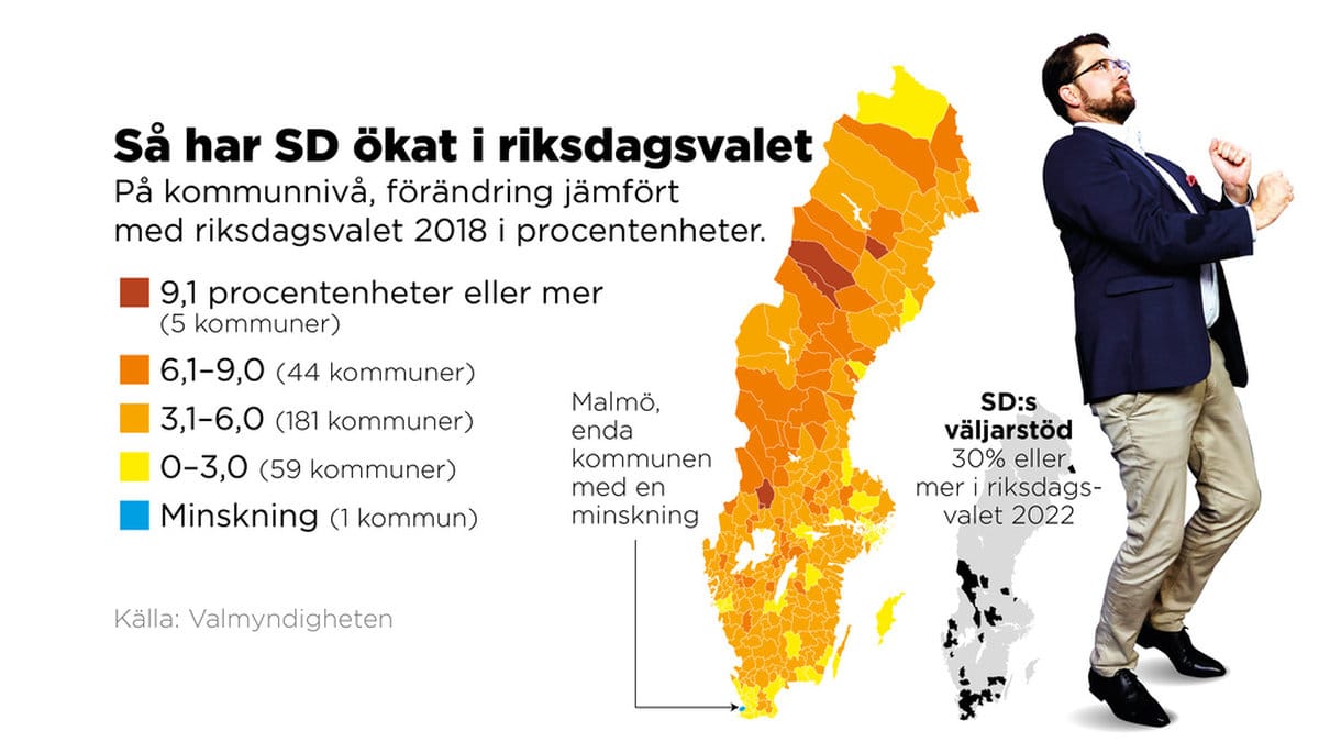 Även om SD vuxit mest i skogslänen gick partiet framåt i så gott som hela landet. Enda undantaget är Malmö, som noterar en liten minskning (–0,4 procentenheter).