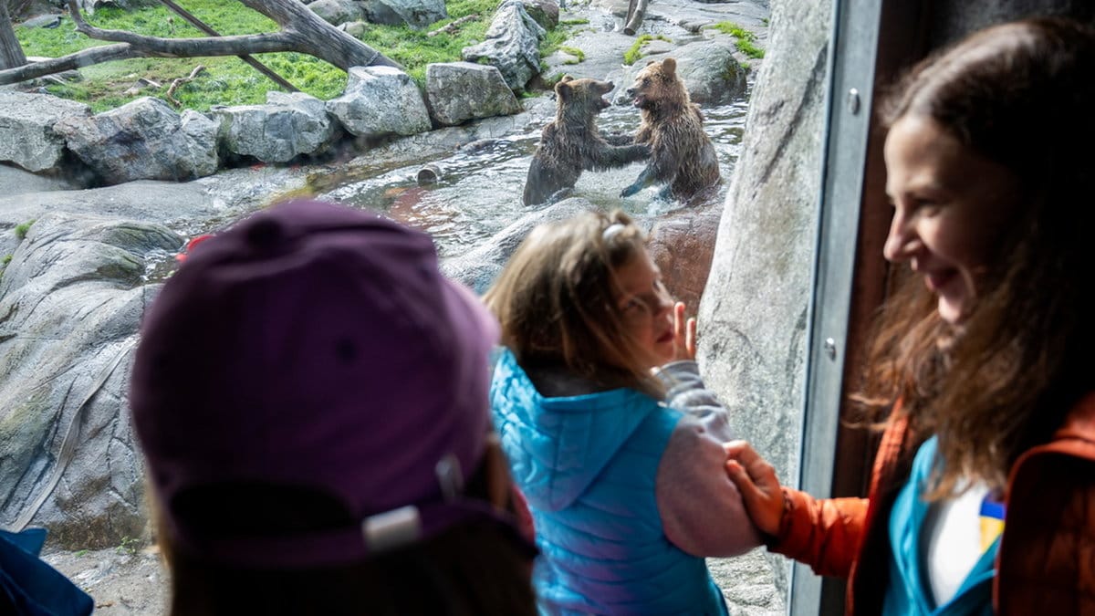 Av Skansens attraktioner tycks Björnberget vara den mest populära under rundturen och barnen står klistrade vid glasrutan för att se hur två björnar plaskar runt i en vattenpöl. Här står också ledaren Larysa Osadcha, som berättar att hon tydligt har märkt hur barnen allt mer slappnat av under kollovistelsen.