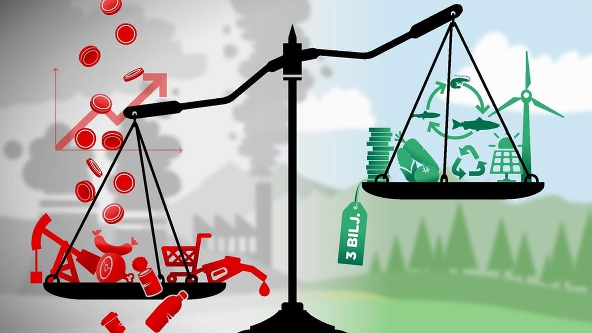 1) Ekonomi. I stället för att jaga BNP-tillväxt behöver länder satsa på att samhället i stort ska må bra. Det måste kosta mer med miljöskadliga varor. Priset är 3 biljoner dollar per år omkring år 2040.