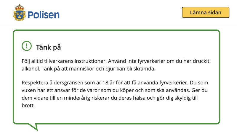 På sin hemsida påminner Polisen om att du måste ha fyllt 18 år för att köpa, inneha och använda utomhusfyrverkerier. Som vuxen ansvarar du också för allt du köper – så ger du fyrverkerier vidare till någon under 18 riskerar du både deras säkerhet och att begå brott.
