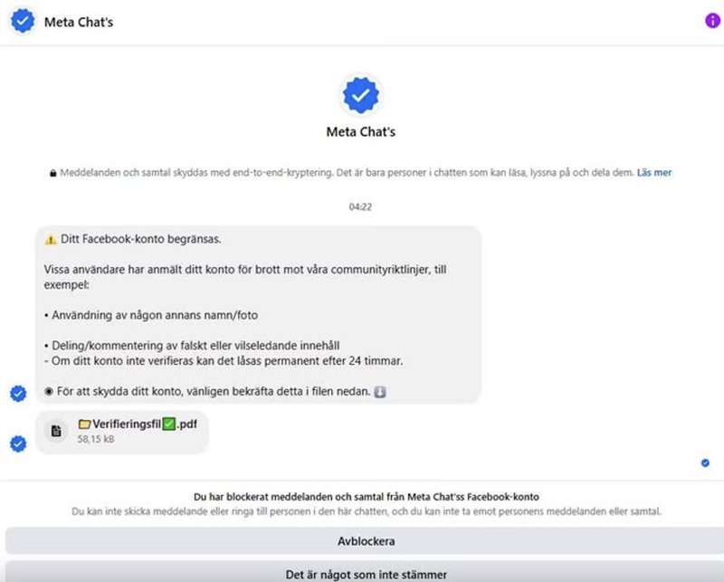 Får du ett Messenger-meddelande från "Meta" som hotar med avstängning och vill att du ska öppna en fil eller logga in via en länk – ska du utgå från att det är en bluff tills motsatsen bevisats.