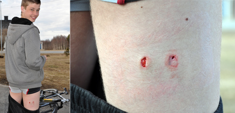 Jakob uppsökte läkarvård efter att bäverns vassa tänder borrat sig två centimeter in i hans lår. Såret fick sys.