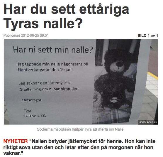 Lilla Tyras Nalle försvann, något som plockades upp av Nyheter24 och även förvandlades till en tvättäkta världsnyhet. Inte nog med det – historien fick dessutom ett lyckligt slut. Tyras nalle kom nämligen tillbaka!