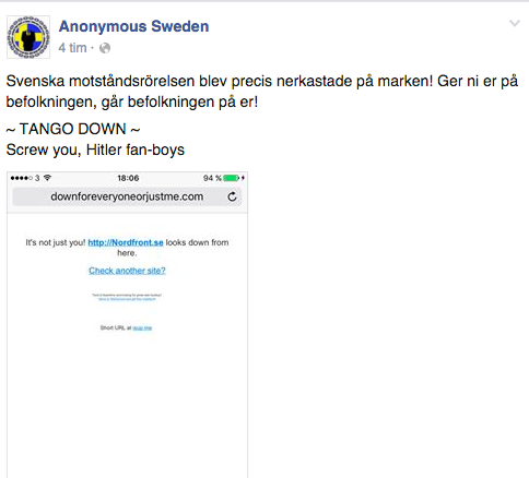 Det gillade inte en del av svenska hackeraktivisterna i Anonymous och stängde ner deras hemsida skriver de på sin Facebook.