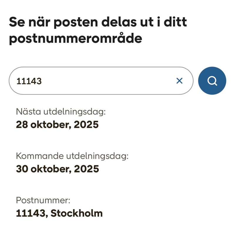 För att ta reda på din utdelningsdag kan du söka på ditt postnummer på Postnords hemsida: