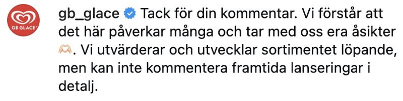 "Vi förstår att det här påverkar många och tar med oss era åsikter. Vi utvärderar och utvecklar sortimentet löpande, men kan inte kommentera framtida lanseringar i detalj."