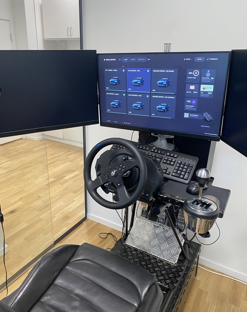 Jag sätter mig i simulatorn för första gången. Det finns en bilstol, tre pedaler, en Playstation-ratt. Skärmen tänds, jag väljer automat framför manuell. Vi behöver inte göra det här svårare än vad det redan är.