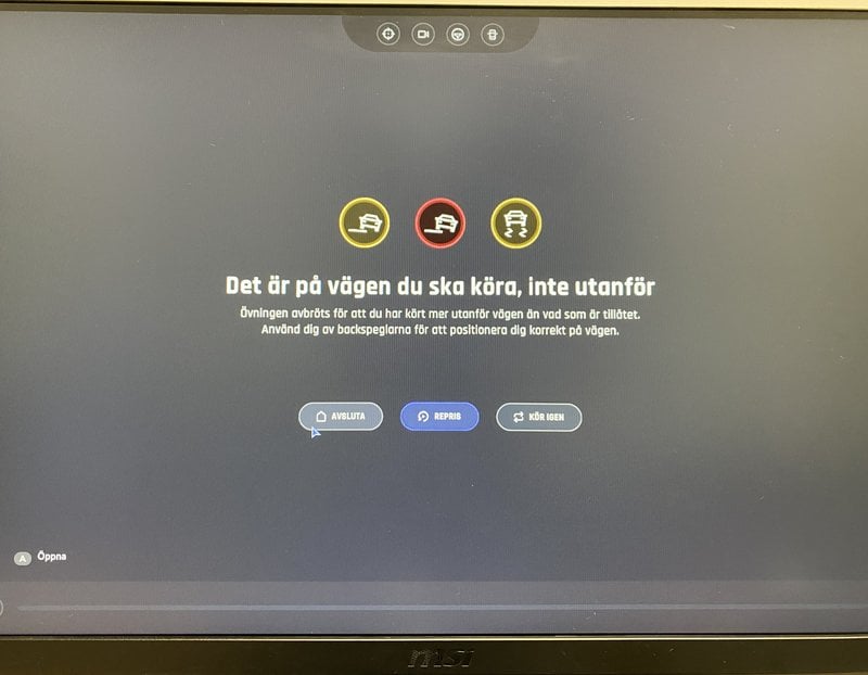 Det är dock fortsatt lite svårt att reglera hastigheten. Ska jag gasa hela tiden? När ska jag bromsa? Och när ska jag bara glida med? Nästa sväng närmar sig, den är skarp. Jag gasar på, det var fel beslut, nu går det för fort, jag tappar kontrollen och åker av vägen. Ratten skakar och snurrar, övningen stängs ner. Ett meddelande dyker upp.