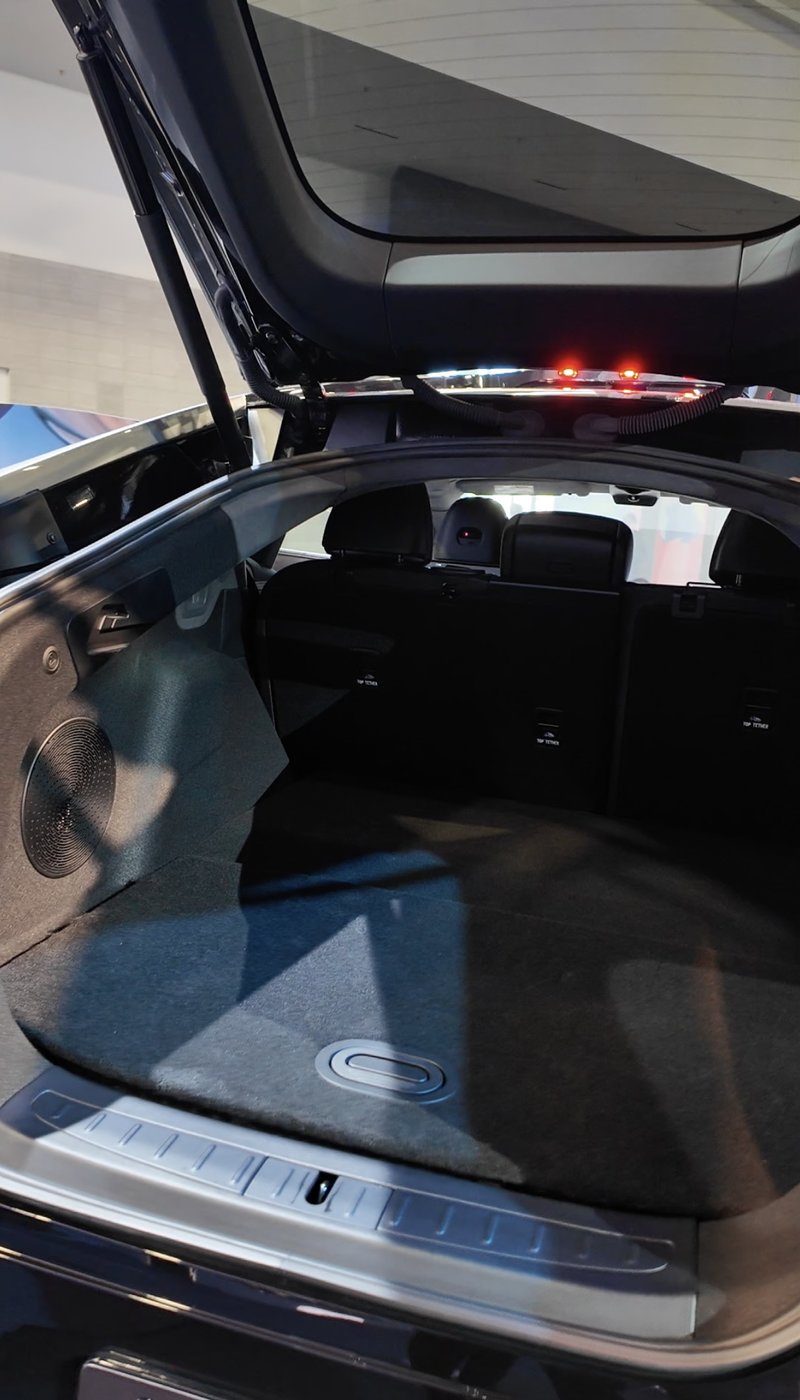 Jag får tyvärr inte testa AI-läget in action. Efter fram- och baksätet visar hon i stället baksätet och bakluckan. Interiören känns lyxig, med mjuk mocka på större delen av kupén, stora elstolar med värme, kyla och massage samt stämningsbelysning som går runt hela bilen.