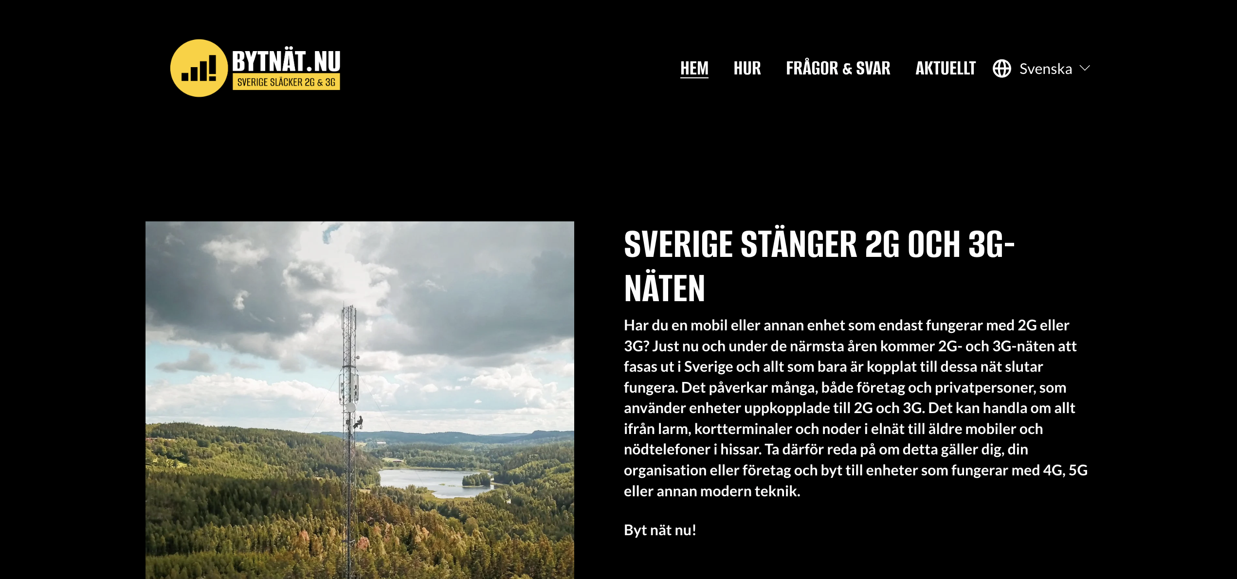 2G- och 3G-näten kommer att släckas ner vid olika tillfällen. Så här förklarar man det på bytnat.nu, som är en de lav en informationskampanj initierad av TechSverige tillsammans med mobiloperatörerna Tele2, Telenor, Telia och Tre: