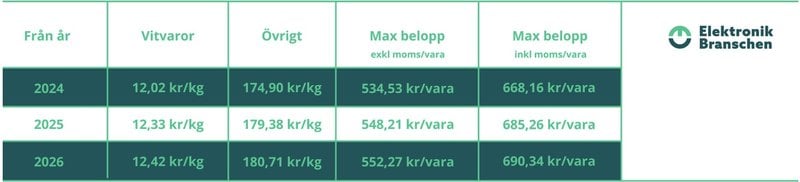Kostnaden går upp till 12,42 kronor per kilo för vitvaror och 180,71 kronor per kilo för övrig elektronik. Samtidigt går maxbeloppet från 548,21 kronor till 552,27 kronor per vara.