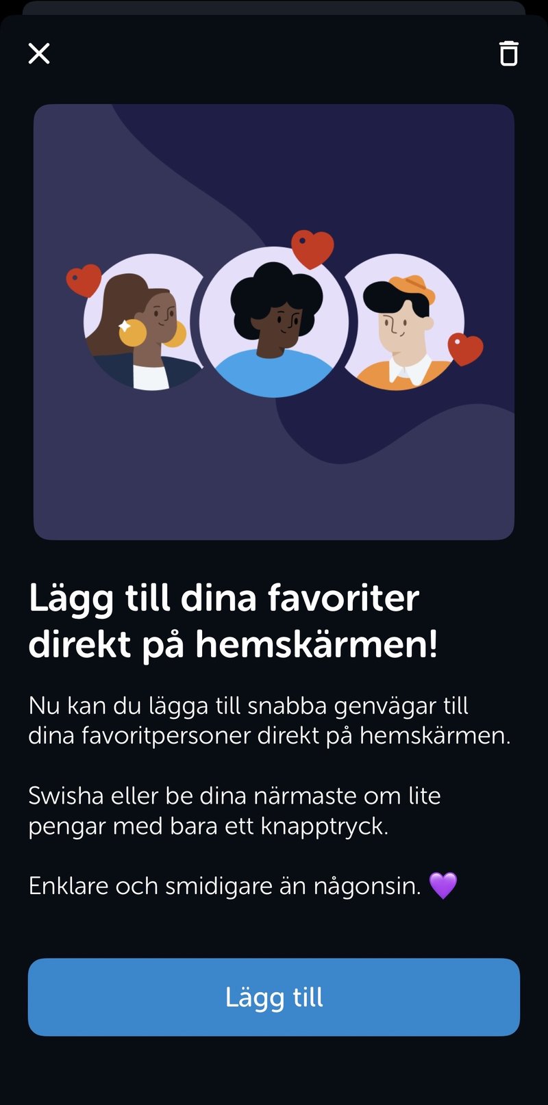"Nu kan du lägga till snabba genvägar till dina favoritpersoner direkt på hemskärmen. Swisha eller be dina närmaste om lite pengar med bara ett knapptryck."